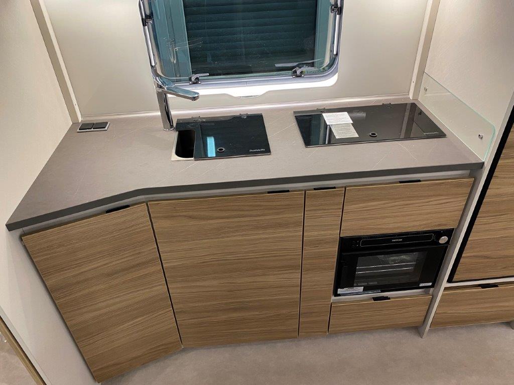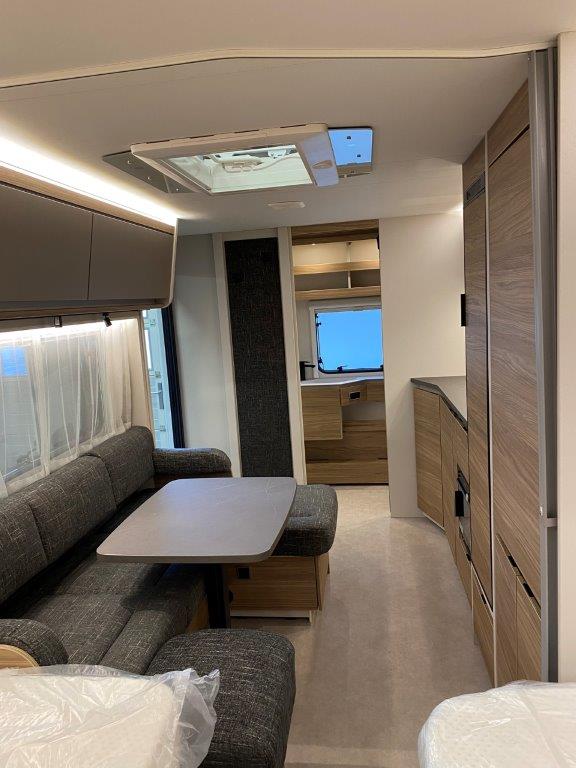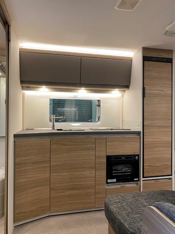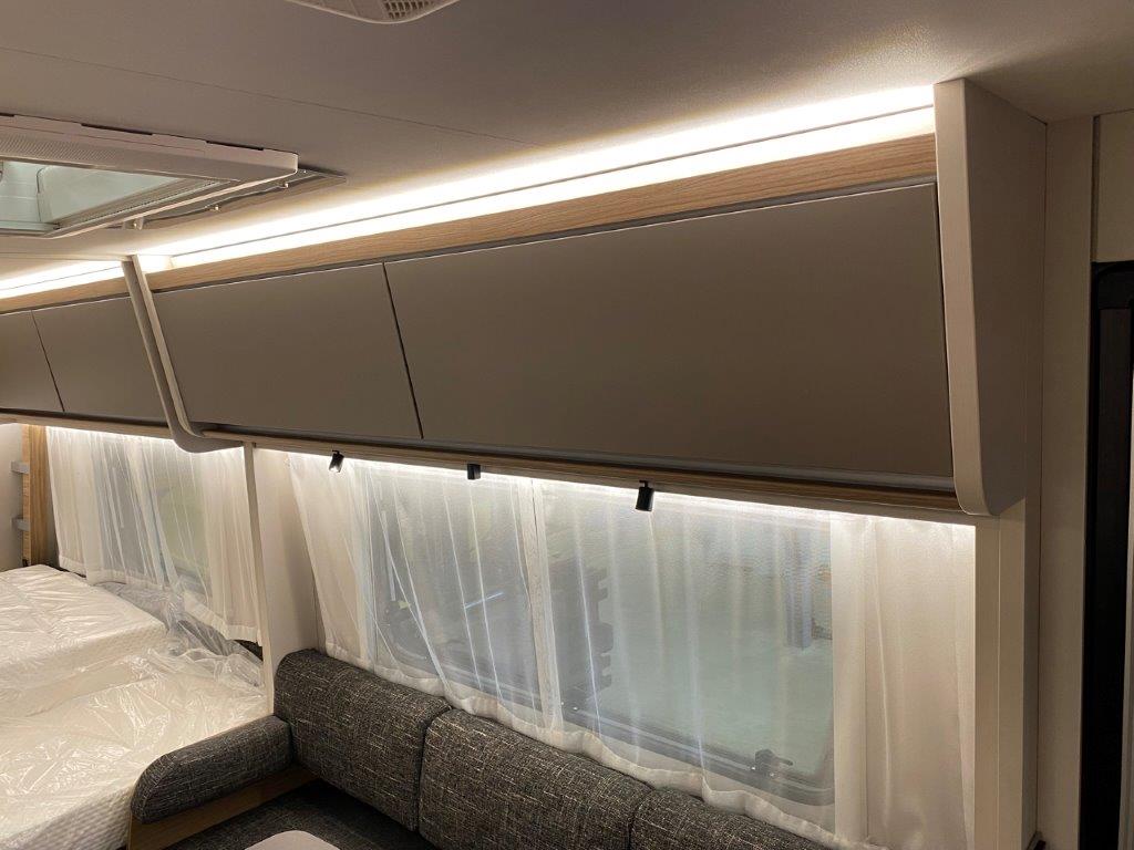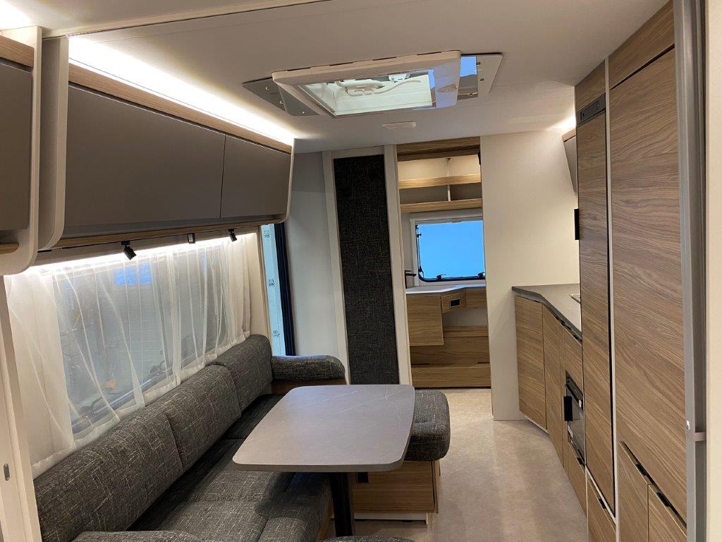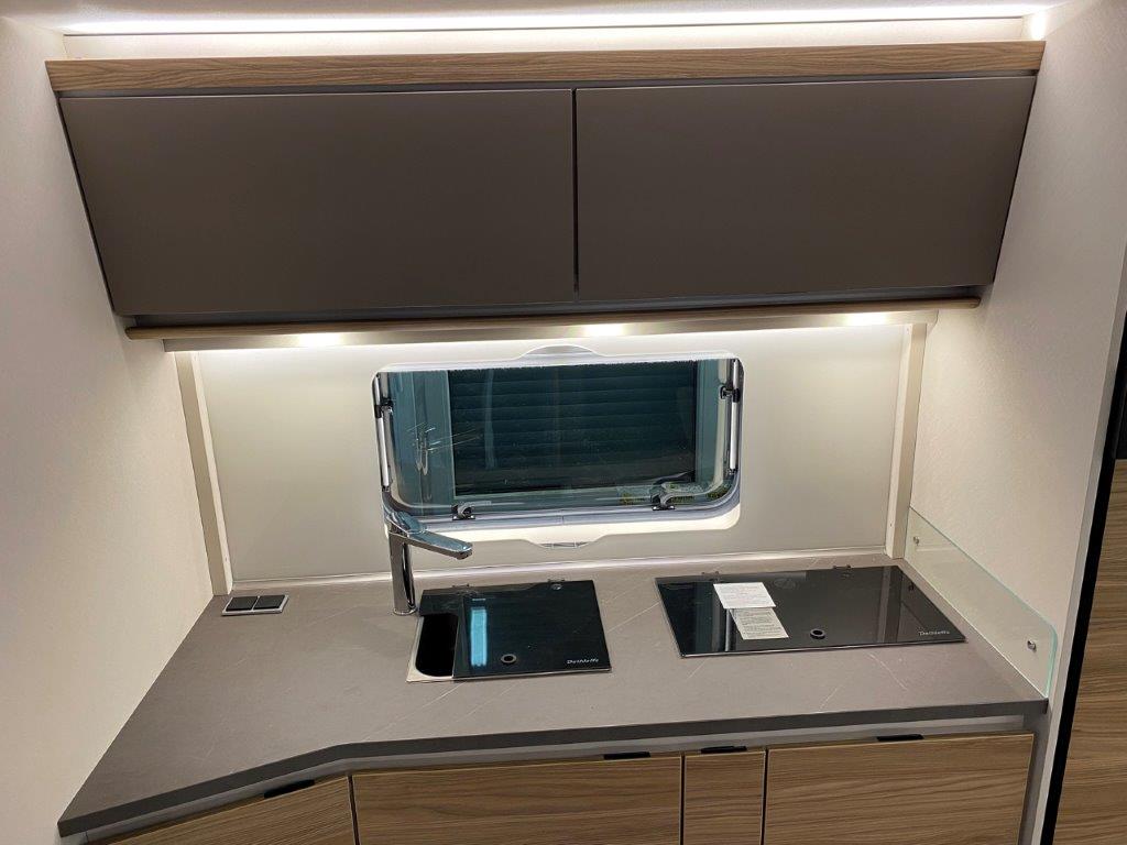 Im Wohnraum des neuen Nomad harmonieren das warme Holz-Dekor der Möbel, basaltgraue Dachschrankklappen sowie kieselgraue Arbeitsflächen perfekt miteinander und schaffen einen stilvollen Lebensraum zu Wohlfühlen. Dazu trägt auch das durchdachte Lichtkonzept bei, mit indirekten Lichtquellen oberund unterhalb der Dachschränke, an der Küchenarbeitsfläche und einer hinterleuchteten Küchenrückwand.