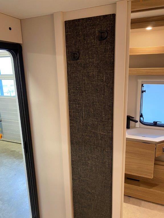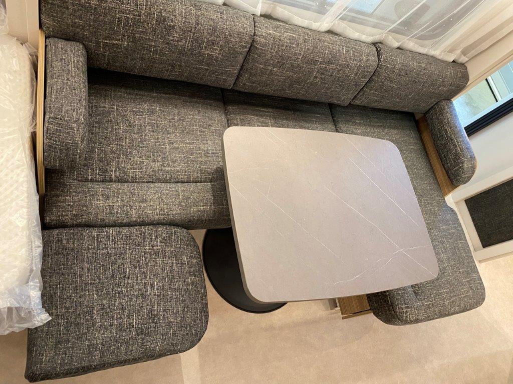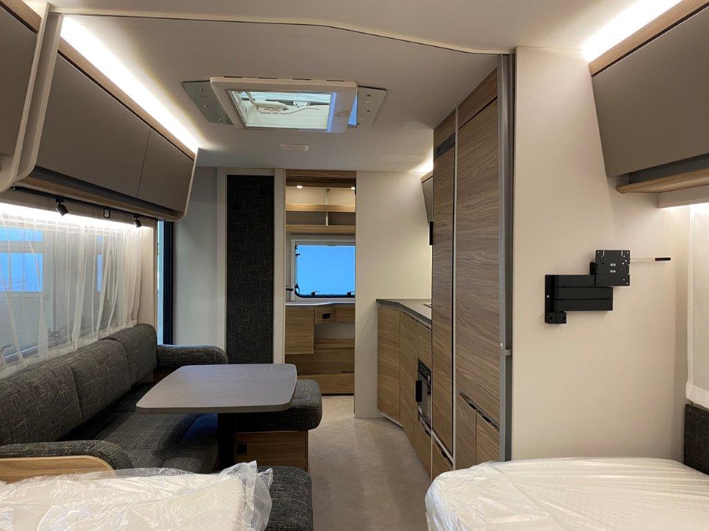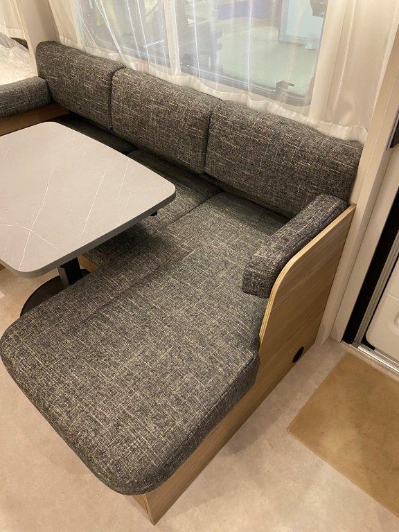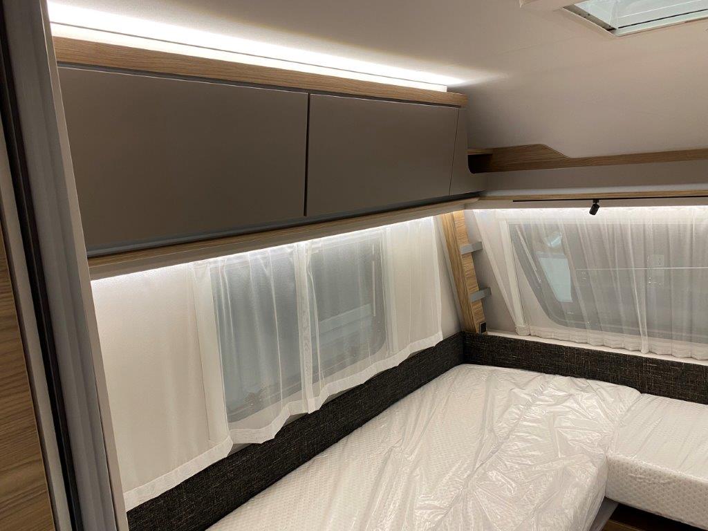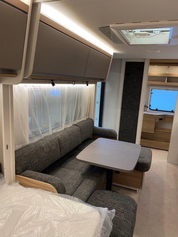 Im Wohnraum des neuen Nomad harmonieren das warme Holz-Dekor der Möbel, basaltgraue Dachschrankklappen sowie kieselgraue Arbeitsflächen perfekt miteinander und schaffen einen stilvollen Lebensraum zu Wohlfühlen. Dazu trägt auch das durchdachte Lichtkonzept bei, mit indirekten Lichtquellen oberund unterhalb der Dachschränke, an der Küchenarbeitsfläche und einer hinterleuchteten Küchenrückwand.