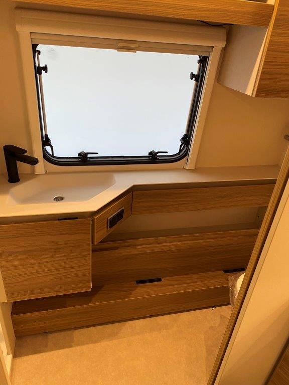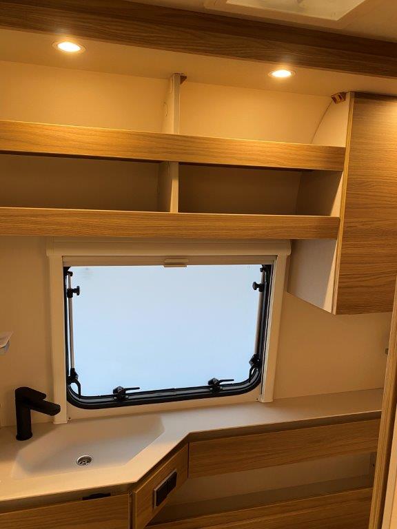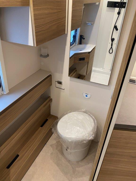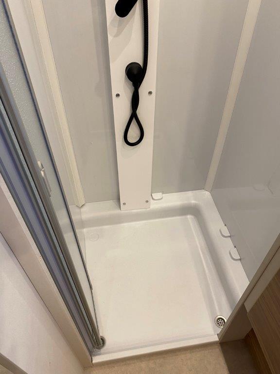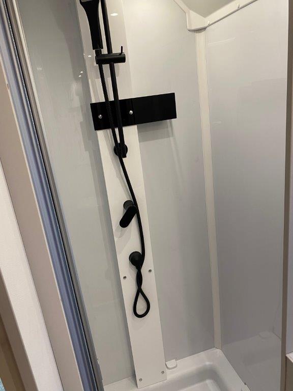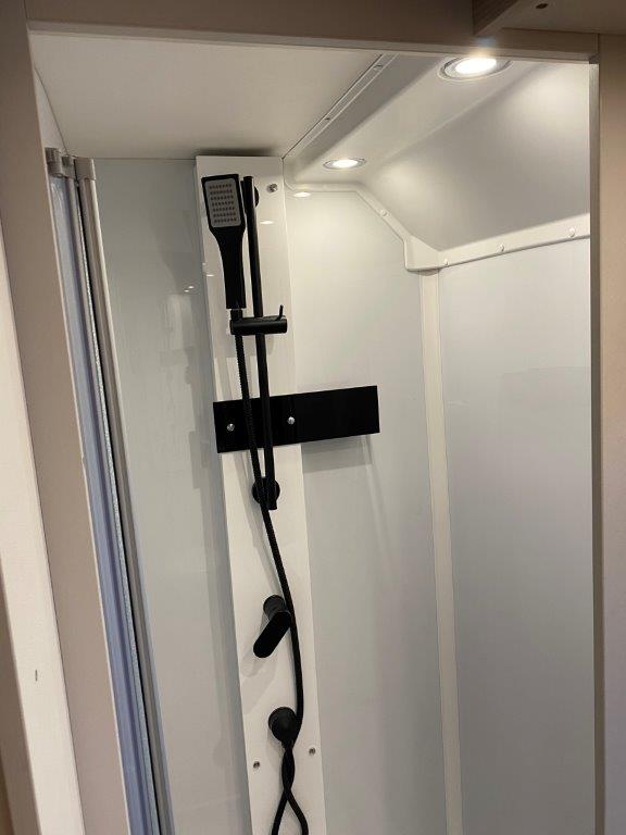 Im großen Heckbad mit separater Duschkabine hat man wunderbar viel Bewegungsfreiheit. Das große Fenster mit Fliegengitter und Verdunklungsrollo sorgt für den nötigen Luftaustausch nach dem Duschen.