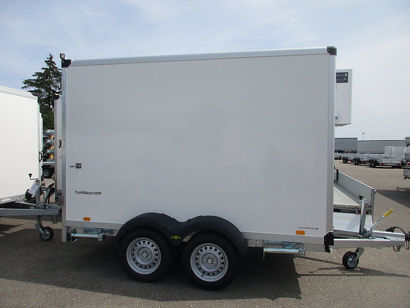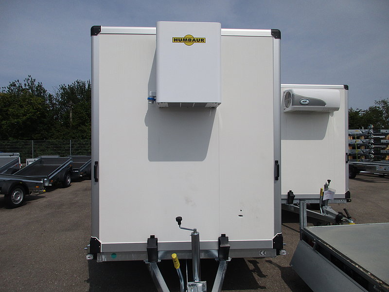 Die Kühlanhänger der Modellreihe HGK Deluxe Tandem bieten alles, was für den sicheren Transport gekühlter Waren notwendig ist: die Kühlzelle ist aufgebaut aus 60 mm starken PurFerro-Sandwich-Paneelen mit einem Kern aus geschäumten Polyurethan mit einer beidseitigen Beschichtung aus verzinktem und pulverbeschichtetem Stahlblech. Der 65 mm starke Isolierboden ist mit einem Antirutschbelag ausgestattet, der für sicheres Be- und Entladen sorgt und durch den höheren Reibungswiderstand auch bei der Ladungssicherung seinen Beitrag leistet. Dieser Boden ist optimal isoliert und lässt die Kälte erst gar nicht nach unten entweichen. Die doppelflügeligen Kühltüren sind abschließbar, können im Notfall aber immer auch von Innen geöffnet werden. Sie sind über Edelstahlscharniere mit dem Anhängeraufbau verbunden. An den Innenwänden ist eine 150 mm hohe Scheuerleiste aus Aluminiumblech befestigt. Rahmen und Fahrwerk sind aus feuerverzinktem Stahl gefertigt, ebenso das geschweißte Heckportal. Vier schwenkbare Teleskopkurbelstützen ermöglichen den sicheren Stand des PKW-Anhängers. Die Einfassungen des HGK Deluxe Tandem bestehen aus eloxiertem Aluminium, ebenso die Regenrinne am Heck. Für jeden Bedarf findet sich der passende Tandem-Kühlanhänger: Modelle mit zulässigem Gesamtgewicht von 2000 kg bis 3500 kg sind verfügbar, die Nutzlast beträgt modellabhängig zwischen 1329 kg und 2229 kg, die Ladehöhe variiert je nach Modell zwischen 590 und 630 mm. Das eingesetzte Kühlaggregat des Markenherstellers Govi erlaubt eine Temperatur im Kühlanhänger von +2°C bis +10°. Das Kühlaggregat wird über 230-V-Netzspannung versorgt und arbeitet bis zu einer maximalen Außentemperatur von 40°C. Eine Kühlung während der Fahrt ist bauartbedingt bei diesen Anhängern nicht möglich.